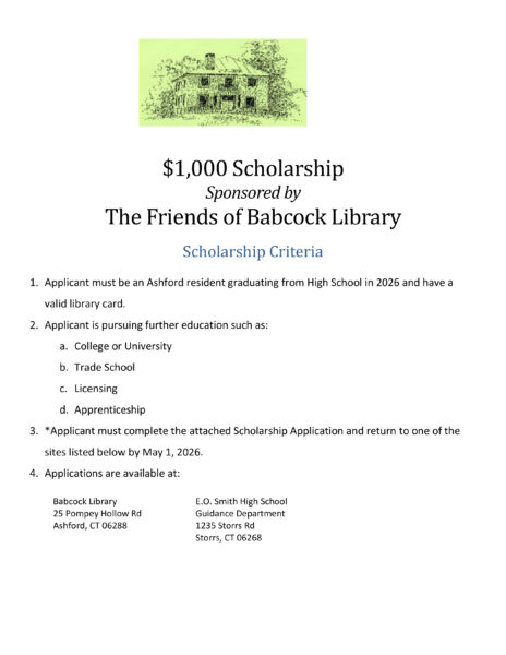 Ashford residents graduating from High School in 2026 with a valid library card are welcome to apply for the Friends of Babcock Library $1,000 Scholarship. Look below for scholarship criteria and application.