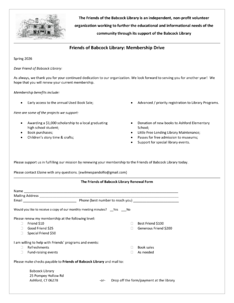 Ashford residents graduating from High School in 2026 with a valid library card are welcome to apply for the Friends of Babcock Library $1,000 Scholarship. Look below for scholarship criteria and application.