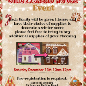 Gingerbread Houses! Family Fun Visit Babcock Library and have fun constructing a Gingerbread House! Event ... 13 Dec 10:00 AM - 12:00 PM Babcock LibraryAshford, CT